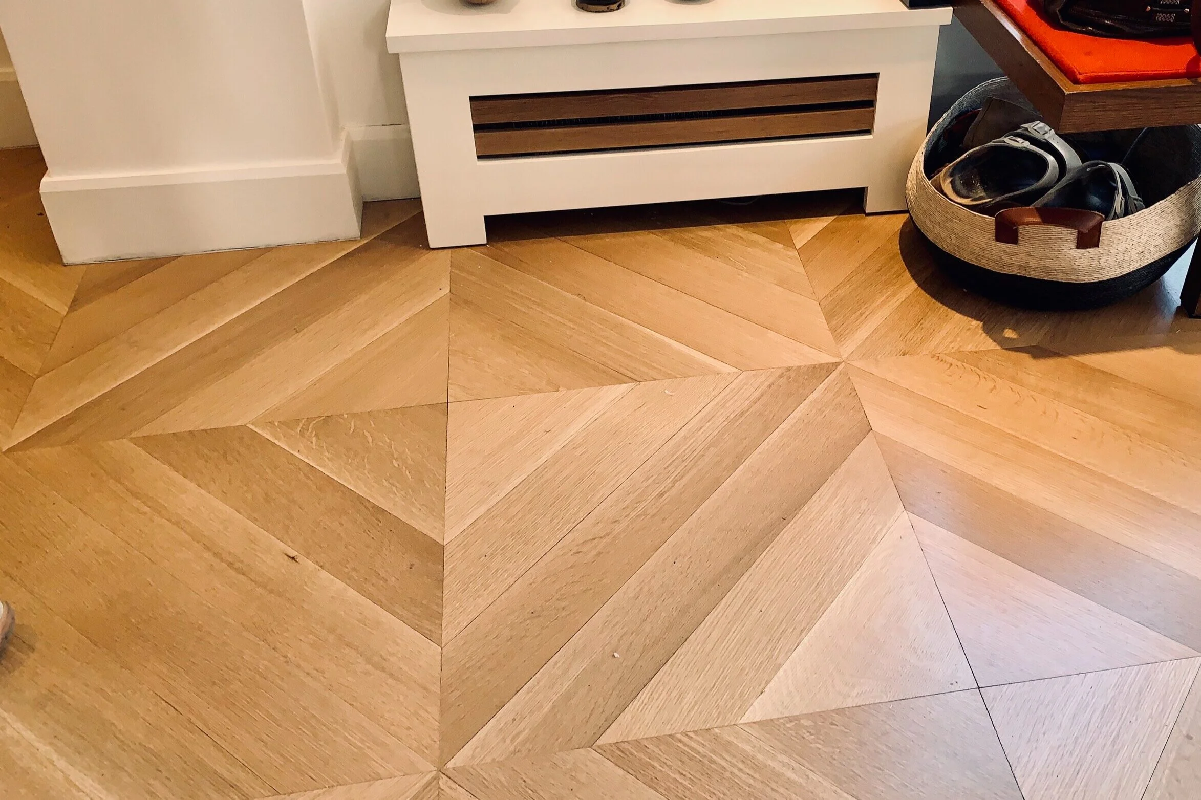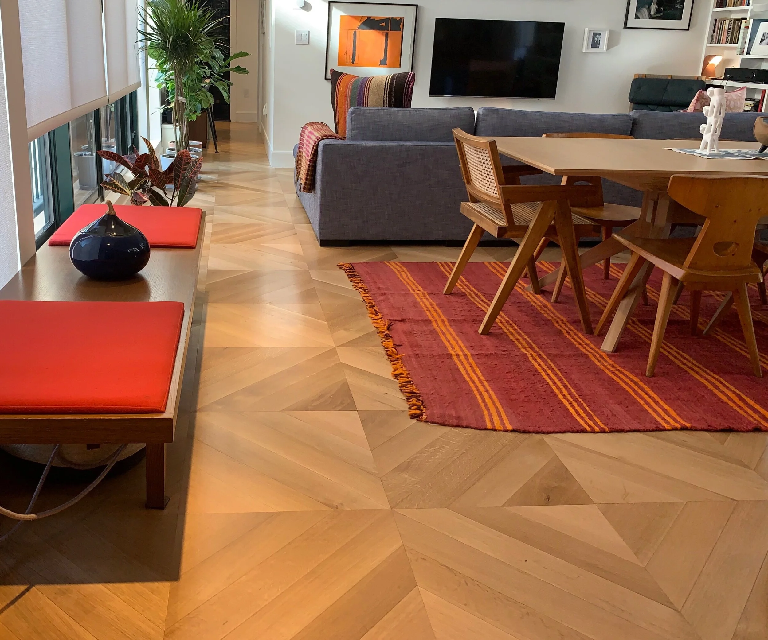 In the field mock ups: This pattern utilized 4” & 7” solid White Oak which was custom cut onsite
